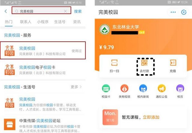2)打开支付宝APP里的完美校园“去付款”对准终端机扫码模块支付;
