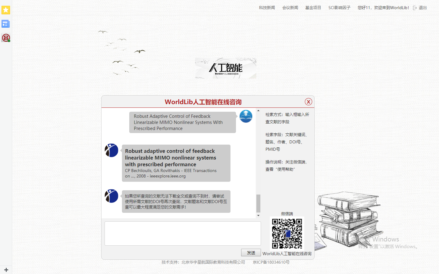 为了更好地满足我校科研人员对外文文献的需求,图书馆现面向全校师生开通试用“WorldLib人工智能在线咨询平台”。该平台运用最新网络技术整合多个搜索引擎,通过微信公众号端和网页端两种使用方式为读者提供外文文献获取。