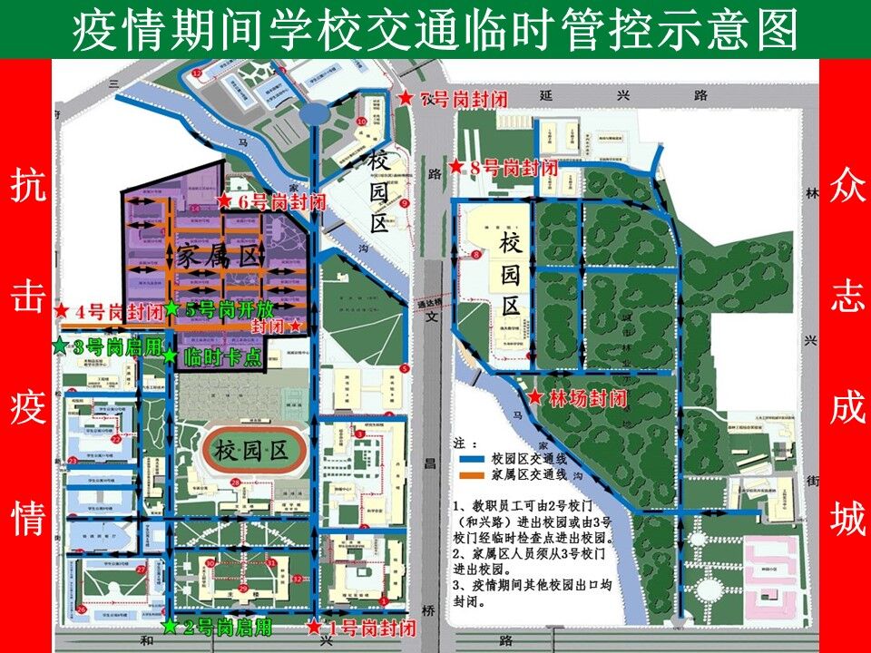 2、在校园东路(家属37号附近)设置1处临时卡点,与学校2号门作为进出校园的二个通道,教职员工可由学校2号校门(和兴路上)进出校园,或由3号校门(哈平六道街上)及临时卡点进出校园;3号校门(哈平六道街上)为进出家属区唯一通道;