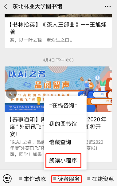 2、点击一级菜单“读者服务”-“朗读小程序”,长按识别二维码进入;