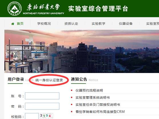 1.请用校园网络登录“东北林业大学实验室综合管理平台”(网址http://sys.nefu.edu.cn/),点击统一身份认证登录,用数字东林的用户名和密码。
