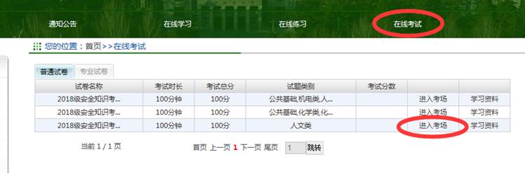 4.选择“在线考试”菜单,选择对应专业名称的试卷(将鼠标放置试卷名称位置,即显示完整的专业名称试卷),点击“进入考场”,考试结束后点击“提交试卷”,可以直接查询成绩,系统自动记录最高成绩。