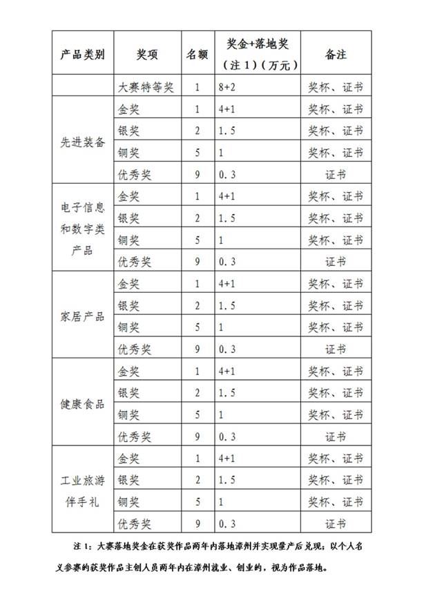 4.大赛设计创意组获奖作品在我市落地转化生产的,根据漳州市人民政府办公室《关于加快工业设计产业发展八条措施》(漳政办〔2019〕99号)文件,按生产企业购买获奖作品成果交易额的10%给予补助,最高不超过30万元。
