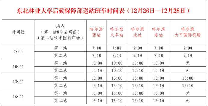 第一站整点发车前往第二站,第二站整点过十分发车,分别前往哈站、西站、北站、东站、机场。(具体发车时间详见班车时间表)