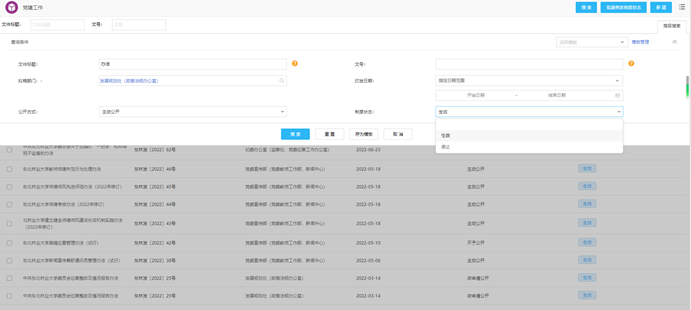 为满足师生查询需要,制度门户可以通过制度类别、标题、文号、内容、拟稿部门、印发日期、公开方式,以及制度状态(时效性)等多个维度进行检索。用户可同时采取多种条件进行筛选,进一步缩小目标文件范围,提高文件检索效率(具体操作指南详见附件)。