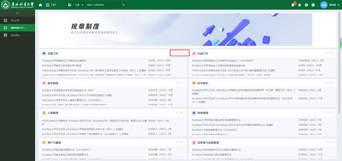 根据规章制度规范内容,制度门户共分为12个子模块,即党建工作、行政工作、教学管理、科学研究、人事管理、财务管理、资产与基建、实验室与设备管理、学生教育与管理、留学生教育、继续教育、公共管理。