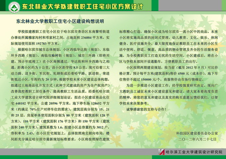 根据发展规划,学校拟在哈尔滨市香坊区邓家村和穆家沟村之间建设总面积50余万平方米的东北林业大学教职工住宅小区。为能够使广大教职员工更直观地了解小区的总体规划及建设构想,经哈尔滨工业大学建筑设计研究院规划设计,学校决定于2012年6月27日—2012年7月3日在综合办公楼大厅展示小区模拟规划图样,同时在网上进行展示,并诚征意见和建议。敬请广大教职员工踊跃参观,并下载附件,严肃认真填写征求意见表,交至本单位办公室。各单位汇总并加盖单位公章后请于7月3日下午下班前交至科技园区建设委员会办公室(原银行学校院内工程公司办公楼407房间)。未交表个人及单位默认为无意愿购买。