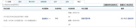 3.选择“考试”菜单,点击“进入考试”,考试结束后点击“提交试卷”,可以直接查询成绩,考试次数最多为10次,系统自动记录最高成绩。