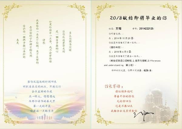 希望通过这份饱含深情的书香印迹激励你们继续坚持阅读,勇敢前行!请需要 “我的图书馆时光”卡片的毕业生到图书流通部(图书馆B207室)领取。