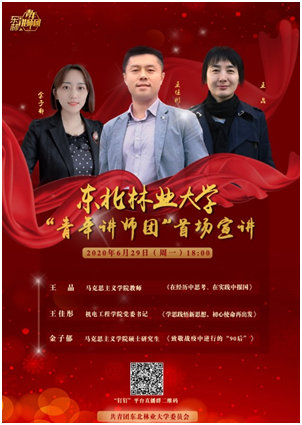 为热烈庆祝中国共产党成立九十九周年,向党的生日献礼,进一步强化青年思想政治引领工作,加强青年理论武装,传播青年声音、凝聚青年力量,东北林业大学“青年讲师团”首场宣讲活动即将开始!