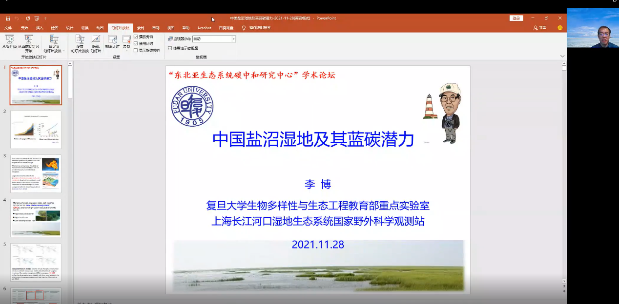 论坛下半场学术报告由周旭辉教授主持。兰州大学/北京大学贺金生教授、复旦大学李博教授、中国科学院地理科学与资源研究所何洪林教授、中山大学袁文平教授分别做《我国草地固碳现状、机制及增汇途径》、《中国盐沼湿地及其蓝碳潜力》、《CERN长期生态监测数据挖掘与联网研究》与《面向碳中和的陆地生态系统碳循环模型研究》主旨报告。专家们详细介绍了我国主要陆地生态系统碳汇时空格局及其主要驱动机制,并对未来碳中和研究提出了展望与建议。
