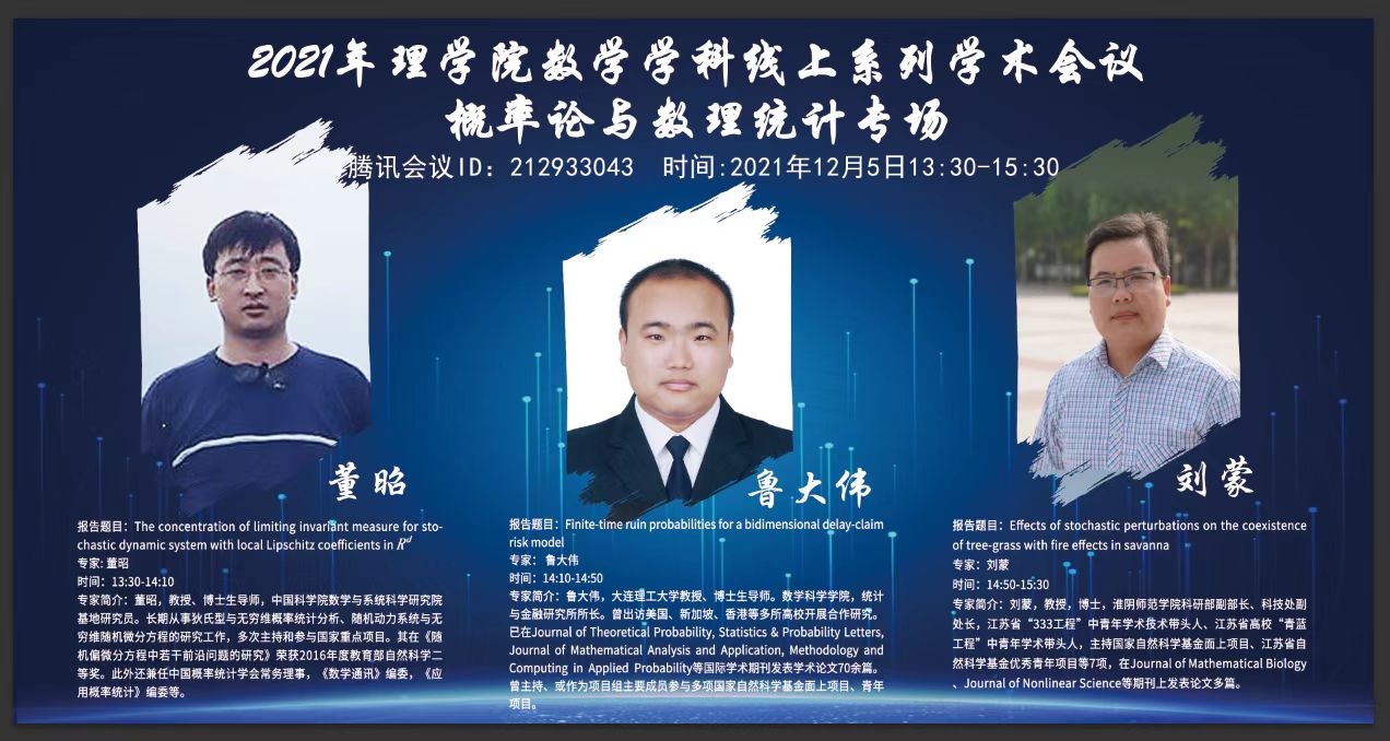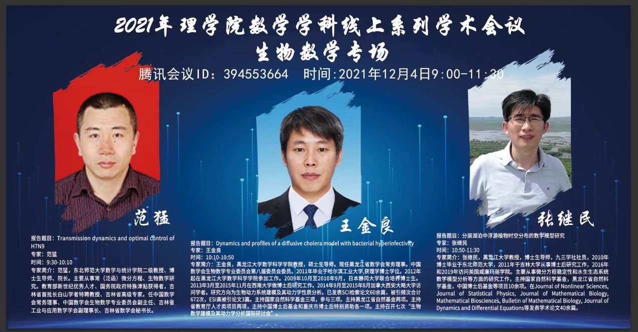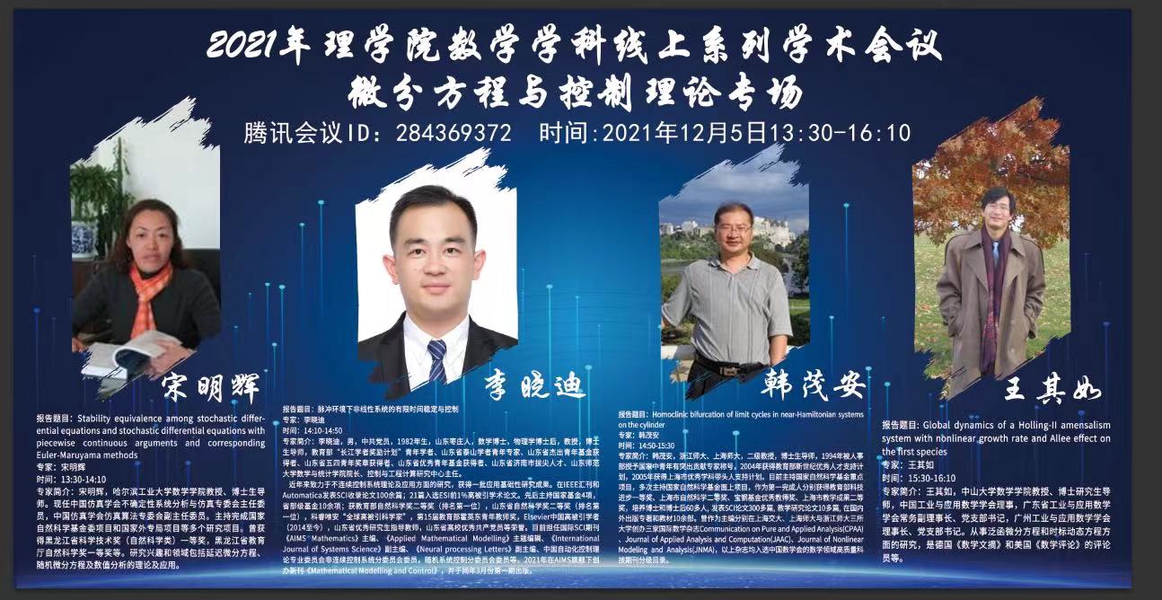12月4日上午举办了生物数学专场,12月5日下午线上同步举办了微分方程与控制理论专场、代数专场和概率论与数理统计专场。四个专场共计三百余人次在线参加,此次交流会在校内外师生间产生热烈反响。