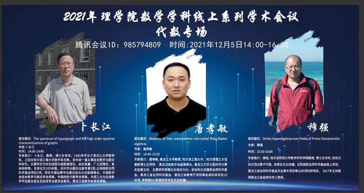 12月4日上午9时,理学院数学系在锦绣楼502和腾讯会议线上同步举行了“2021年数学学科线上系列学术会议”开幕式。会议由数学系主任王文龙主持,理学院院长安勇致开幕词;在线下到场参加开幕式的还有数学学科带头人张春蕊教授和青年骨干教师杨瑞智副教授。
