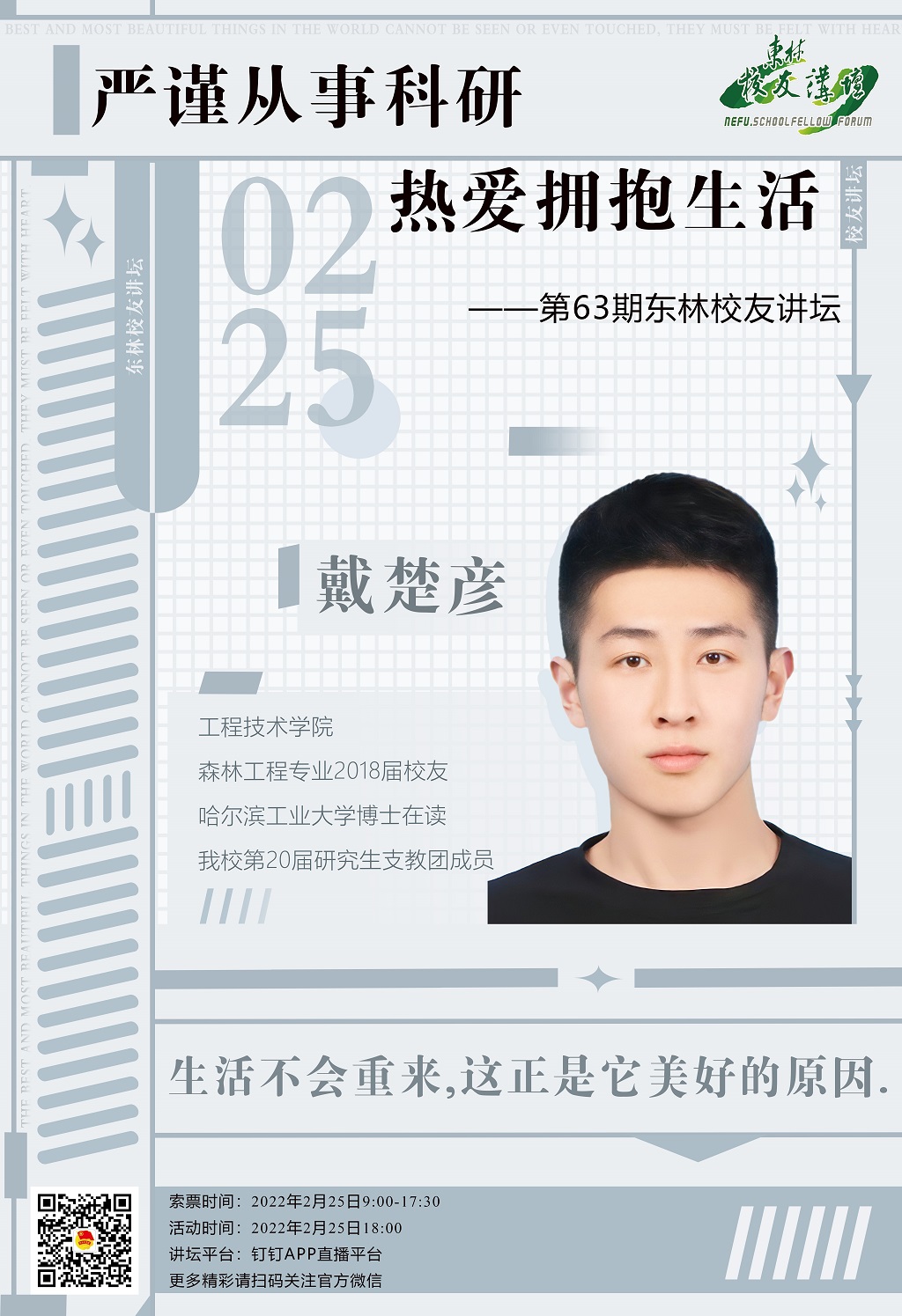 参与方式:通过关注“东林团委”官方微信平台(nefutw)进行抢票。凭“抢票成功”凭证方可加入钉钉群参与活动。