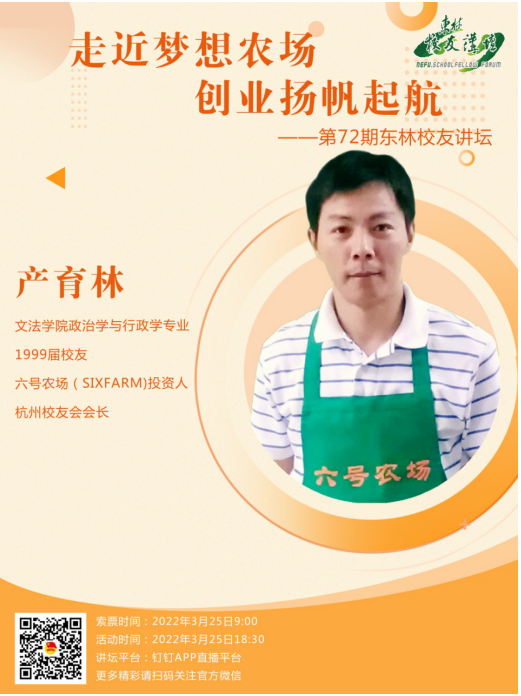 主讲嘉宾:文法学院政治学与行政学专业1999届校友、六号农场(SIXFARM)投资人、东北林业大学杭州校友会会长 产育林