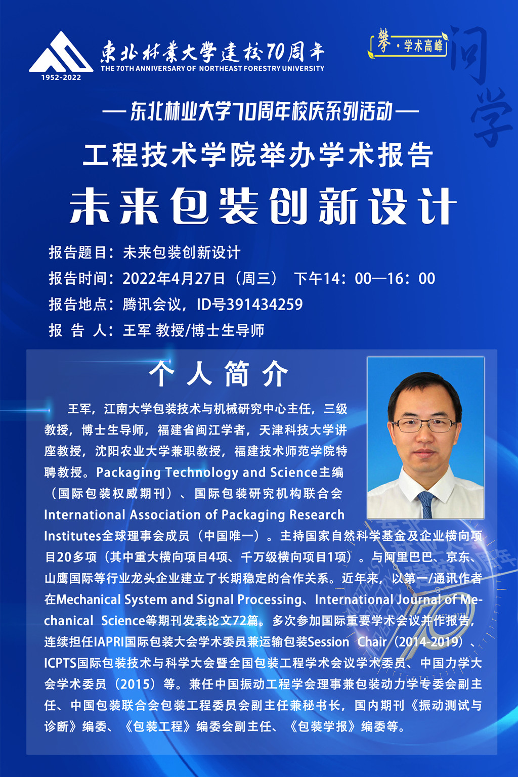 个人简介:王军,江南大学包装技术与机械研究中心主任,三级教授,博士生导师,福建省闽江学者,天津科技大学讲座教授,沈阳农业大学兼职教授,福建技术师范学院特聘教授。Packaging Technology and Science主编(国际包装权威期刊)、国际包装研究机构联合会 International Association of Packaging Research Institutes全球理事会成员(中国唯一)。主持国家自然科学基金及企业横向项目20多项(其中重大横向项目4项、千万级横向项目1项)。与阿里巴巴、京东、山鹰国际等行业龙头企业建立了长期稳定的合作关系。近年来,以第一/通讯作者在Mechanical System and Signal Processing、International Journal of Mechanical Science等期刊发表论文72篇。多次参加国际重要学术会议并作报告,连续担任IAPRI国际包装大会学术委员兼运输包装Session Chair(2014-2019)、ICPTS国际包装技术与科学大会暨全国包装工程学术会议学术委员、中国力学大会学术委员(2015)等。兼任中国振动工程学会理事兼包装动力学专委会副主任、中国包装联合会包装工程委员会副主任兼秘书长,国内期刊《振动测试与诊断》编委、《包装工程》编委会副主任、《包装学报》编委等。