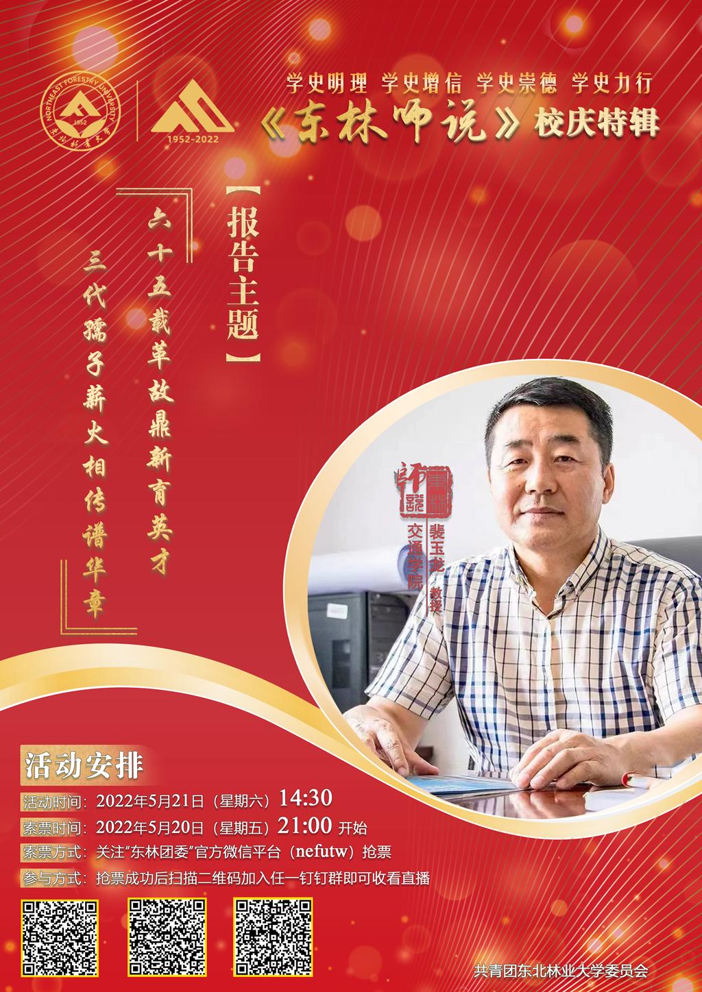 裴玉龙教授将结合自身工作经历,回顾我校交通学科、专业发展历程及取得的进步和成就,重点讲述我校交通学科近年来在学科建设、专业发展、科学研究、教育教学改革、人才培养等方面的长足进步及丰硕成果,弘扬“团结拼搏、自我激励、发挥优势、争创一流”的当代东林精神,展望学校、学科发展的美好未来。