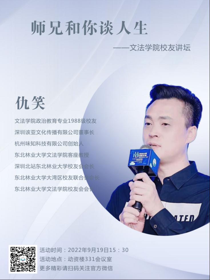 主讲嘉宾:仇笑 文法学院政治教育专业1988级校友,深圳该亚文化传播有限公司董事长、杭州味知科技有限公司创始人、东北林业大学文法学院客座教授、东北林业大学深圳校友会会长、文法学院校友会会长