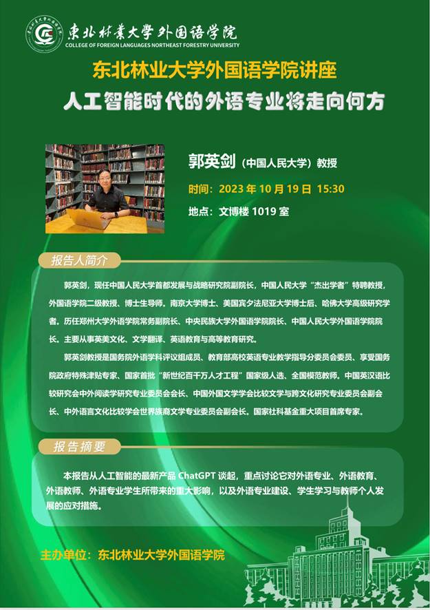 郭英剑教授是国务院外语学科评议组成员、教育部高校英语专业教学指导分委员会委员、享受国务院政府特殊津贴专家、国家首批“新世纪百千万人才工程”国家级人选、全国模范教师。中国英汉语比较研究会中外阅读学研究专业委员会会长、中国外国文学学会比较文学与跨文化研究专业委员会副会长、中外语言文化比较学会世界族裔文学专业委员会副会长。国家社科基金重大项目首席专家。