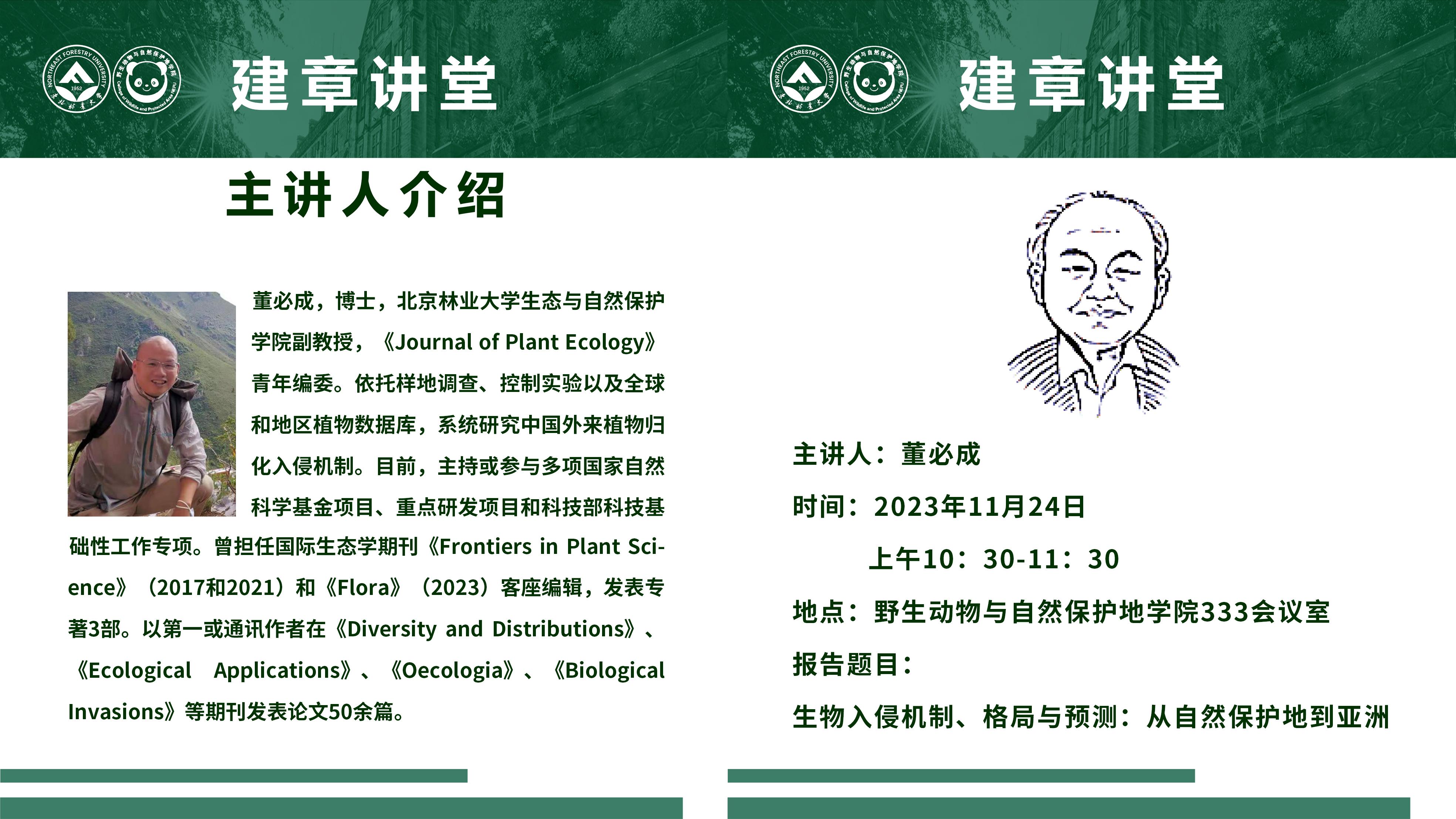 董必成,博士,北京林业大学生态与自然保护学院副教授,《Journal of Plant Ecology》青年编委。依托样地调查、控制实验以及全球和地区植物数据库,系统研究中国外来植物归化入侵机制。目前,主持或参与多项国家自然科学基金项目、重点研发项目和科技部科技基础性工作专项。曾担任国际生态学期刊《Frontiers in Plant Science》(2017和2021)和《Flora》(2023)客座编辑,发表专著3部。以第一或通讯作者在《Diversity and Distributions》、《Ecological Applications》、《Oecologia》、《Biological Invasions》等期刊发表论文50余篇。