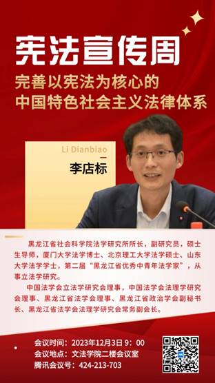 主讲人:李店标,黑龙江省社会科学院法学研究所所长,副研究员,硕士生导师,厦门大学法学博士、北京理工大学法学硕士、山东大学法学学士,第二届“黑龙江省优秀中青年法学家”,从事立法学研究。中国法学会立法学研究会理事,中国法学会法理学研究会理事、黑龙江省法学会理事、黑龙江省政治学会副秘书长、黑龙江省法学会法理学研究会常务副会长。在《政治与法律》《法律方法》《学习与探索》等杂志发表论文80余篇,多篇被《新华文摘》《高等学校文科学术文摘》《人大报刊复印资料》全文转载。出版《立法公开研究》《立法学原理》《我国国家立法权配置优化研究》等著作教材7部。主持国家社科基金、教育部人文社科、最高人民检察院、中国法学会、省社会科学规划、省经济社会发展重点课题等10余项。获省社会科学优秀成果一等奖、三等奖等30余项。参与地方立法起草论证工作100余次,法治宣讲工作40余次。