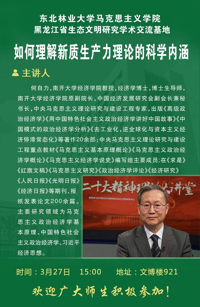 何自力,南开大学经济学院教授,经济学博士,博士生导师南开大学经济学院原副院长,中国经济发展研究会副会长兼秘书长,中央马克思主义理论研究与建设工程专家,出版《高级政治经济学》《用中国特色社会主义政治经济学讲好中国故事》《中国模式的政治经济学分析》《去工业化,逆全球化与资本主义经济停滞常态化》等著作20余部;中央马克思主义理论研究与建设工程重点教材《马克思主义基本原理概论》《马克思主义政治经济学概论》《马克思主义经济学说史》编写组主要成员;在《求是》《红旗文稿》《马克思主义研究》政治经济学评论》《经济研究》《人民日报》光明日报》《经济日报》等期刊、报纸发表论文200余篇。主要研究领域为马克思主义政治经济学基本原理、中国特色社会主义政治经济学、习近平经济思想。