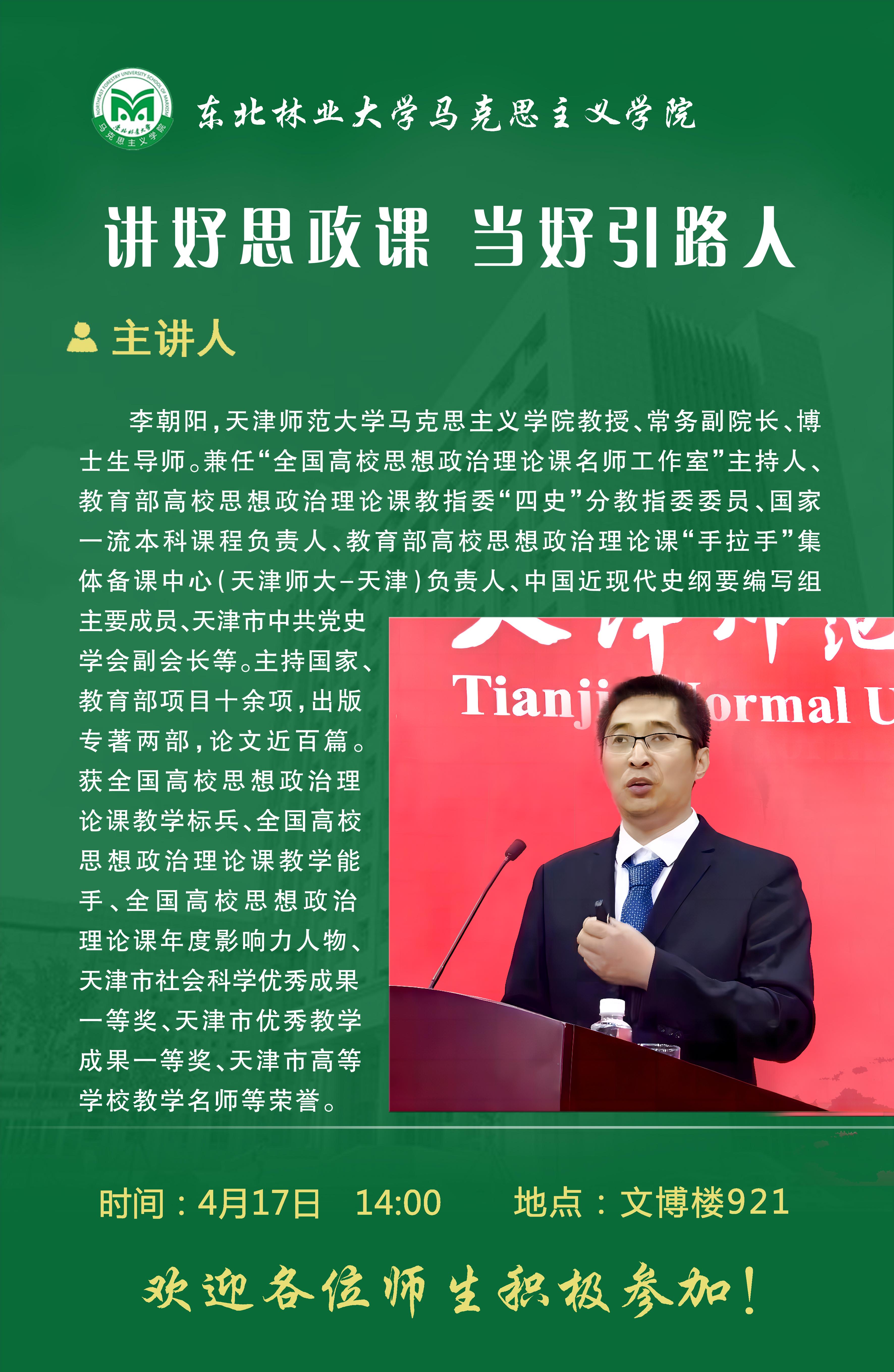李朝阳,天津师范大学马克思主义学院教授、常务副院长、博士生导师。兼任“全国高校思想政治理论课名师工作室”主持人、教育部高校思想政治理论课教指委“四史”分教指委委员、国家一流本科课程负责人、教育部高校思想政治理论课“手拉手”集体备课中心(天津师大-天津)负责人、中国近现代史纲要编写组主要成员、天津市中共党史学会副会长等。主持国家、教育部项目十余项,出版专著两部,论文近百篇。获全国高校思想政治理论课教学标兵、全国高校思想政治理论课教学能手、全国高校思想政治理论课年度影响力人物、天津市社会科学优秀成果一等奖、天津市优秀教学成果一等奖、天津市高等学校教学名师等荣誉。
