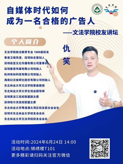 主讲嘉宾:仇笑文法学院政治教育专业1988级校友,香港卫视导演、深圳知名策划人、深圳该亚文化传播有限公司董事长、深圳泰思传媒有限公司、杭州味知科技有限公司、海南幻活食研社股份有限公司创始人、东北林业大学文法学院客座教授、东北林业大学大学生创业园导师、深圳黑龙江高校联盟副主席、深圳哈尔滨高校联盟主席、东北林业大学粤港澳大湾区校友联合会会长、深圳市校友会会长、文法学院校友会会长