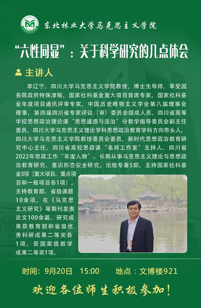 报告人简介:李辽宁,四川大学马克思主义学院教授,博士生导师,享受国务院政府特殊津贴,国家社科基金重大项目首席专家,国家社科基金年度项目通讯评审专家,中国历史唯物主义学会第八届理事会理事,第四届四川省专家评议(审)委员会组成人员,四川省高等学校思想政治理论课“思想道德与法治”分教学指导委员会副主任委员,四川大学马克思主义理论学科思想政治教育学科方向带头人,四川大学马克思主义学院教授委员会委员,新时代思想政治教育研究中心主任,四川省高校思政课“名师工作室”主持人、四川省2022年思政工作“年度人物”。长期从事马克思主义理论与思想政治教育研究、意识形态安全研究。出版专著5部,主持国家社科基金3项(重大项目、重点项目和一般项目各1项),主持教育部、省级课题10余项,在《马克思主义研究》等期刊发表论文100余篇。研究成果获教育部和省级优秀科研成果二等奖各1项,获国家级教学成果二等奖1项。