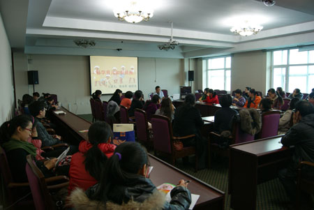权赫花主任详细介绍了“惠家工程”的内容、意义以及在我校的实施情况,并简要介绍了龙江幸福宝贝育儿项目的意义和“东林爱宝贝父母联合会”成立的相关情况。