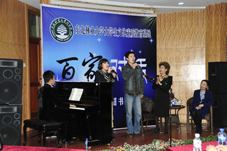 访谈活动中,蒋丽老师、夏靖博老师现场演唱了七首中外声乐作品,用欧洲著名作曲家的经典作品,把欧洲歌剧艺术理出了一条清晰的线索,从莫扎特的《阿里路亚》开始,把罗西尼的《美丽可爱的光》,普契尼的《漫步街上》,直至轻歌剧《风流寡妇》的插曲《默默倾诉》一一献给大家。两位老师深情精湛的演唱不时令全场报以热烈的掌声。在谈及美声唱法与中国民歌的关系时,两位老师又以蒙古族民歌《鸿雁》、新疆维吾尔族民歌《一杯美酒》的演唱现身说法,表明美声唱法处理中国民族歌曲不仅可以唱好,而且已是中国民族歌曲演唱的一条宽广大道。《同一首歌》是大家耳熟能详的通俗歌曲,学生走上前台先以自己的方式演唱了这首歌曲,蒋老师当即评说了两位学生演唱的不同方法,这一互动环节将访谈推向了高潮,在大家的期待中,蒋老师再度与夏老师合作,将这首歌曲以美声唱法进行了演绎,赢得了在场听众的长时间热烈的掌声。