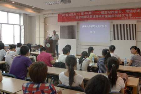 6月17日晚6:00,由研究生部科技创新中心主办的第四十六期“709院长论坛”在我校研究生楼709顺利举行。中国林业元老级人物、东北林业大学著名生态学教授、博士生导师祝宁教授为广大同学带来了一场以“提高写作能力,增强学术造诣”为主题的精彩讲座。
