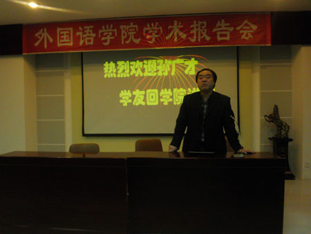 2011年11月2日15点30分,外国语学院85届毕业生孙广才教授作为外国语学院的优秀校友回到外国语学院举办学术讲座。学术讲座在外国语学院学术报告厅举行。此次讲座由外国语学院副院长郭永刚教授主持,学院08级同学以及部分研究生聆听了讲座。