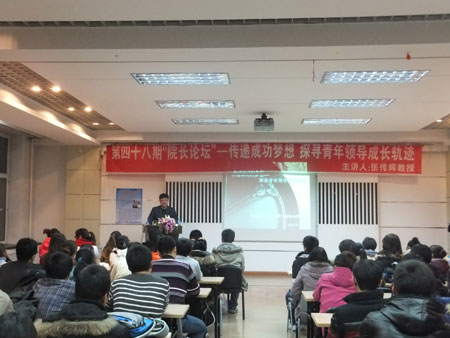 2011年12月6日,由我校研究生院团委组织策划的第四十八期“709院长论坛”主题讲座圆满结束。中国青少年研究会理事、黑龙江省毛泽东思想概论教学研究会副秘书长,东北林业大学马克思主义教学研究部直属党支部书记张传辉教授为同学们带来了题为“传递成功的梦想,探寻青年领导成长的轨迹”的精彩讲座,并在现场和同学们进行了广泛而热烈的交流。