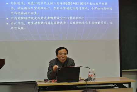 整场讲座在张伟教授与同学们的欢声笑语中进行。张伟教授用条理清晰的思路,发人深省的话语,时下流行的现象将“在保护野生动物问题上为什么要强调科学与理性”、“建设生态文明建设发挥科学保护理念的正能量”、“野生动物保护与生态文明建设”娓娓道来,引起在场同学们的共鸣。讲座伊始,张教授就用鲜活的事例,让同学们了解到在野生动物保护问题上出现的不和谐现象,难以自拔的非理性行为,极端保护理念及其造成的影响。在建设生态文明建设发挥科学保护理念的正能量的讲述中,张教授更是深入浅出地从保护目的、保护对象等多个方面进行了阐述。他先后指出,我们保护的根本目的在于维护生态平衡,保护整个地球的生态安全。我们所保护的对象那些濒危野生动物的野外资源,保护的不是个体,是物种,是种群,而建设魅力中国需要的正是和谐的人与野生动物的关系。野生动物的利用与国计民生,民族传统文化有密切的关系,且不可或缺。野生动物保护与利用是矛盾统一体,需要辩证地处理两者的关系。张教授还凭借自己多年的研究心得,语重心长地提出了自己的建议,他提倡科学保护野生动物要求我们做到“四要”、“四不要”。