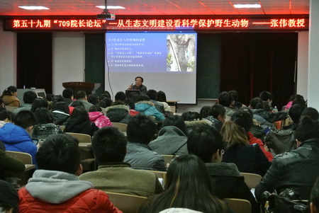 2013年4月11日晚,由研究生院团委主办的第五十九期“709院长论坛”——“ 从生态文明建设看科学保护野生动物”主题讲座在研究生楼004室圆满结束。野生动物资源学院院长张伟教授针对“科学理性保护野生动物的重要性”与 “野生动物保护与生态文明建设”等多个方面与大家畅谈感悟。