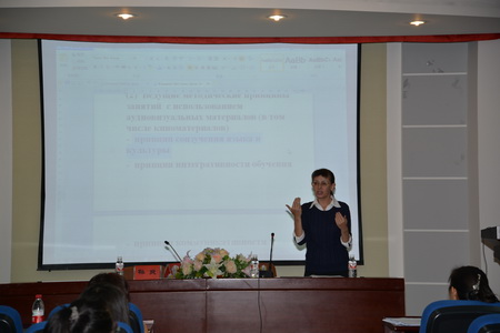 在第一场报告中,Г. П. Корчевская通 过简洁生动的语言、四个经典的影视片段、声情并茂地从对外俄语教学实践中使用影视资料的优势;课堂上使用视听材料的主要教学法原则;影视教材的文化定位及材料选择的原则;剧情潜在的实质和功能;视听文本分析的教学种类;交际中的语言、言语、社会文化观在影视素材中的形成等六个方面,向师生们介绍了影视资料在对外俄语教学中的使用,充分证明了在俄语教学中合理地选择影视资料,并恰到好处地应用到教学中可以使学生在非语言环境下学到鲜活的语言,直观地感受到俄罗斯文化,培养俄语语感和俄语思维。