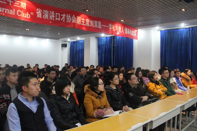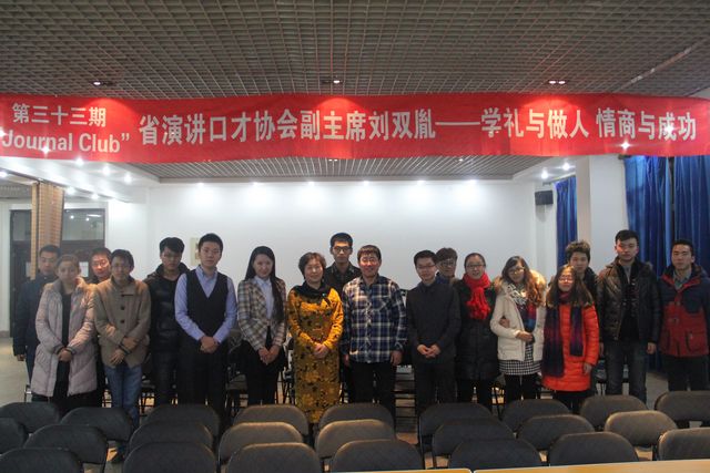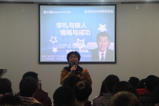 2014年12月19日18:30,东北林业大学校研究生会主办、机电工程学院研究生会协办的第三十三期“Journal Club”活动在研究生楼006室成功举办。黑龙江省演讲口才协会副主席、省演讲口才教育事业突出贡献者、省优秀思想政治工作者、哈尔滨理工大学马克思主义学院教授、学校优秀主讲教师刘双胤,以“学礼与做人,情商与成功”为主题,精彩地讲述了学礼与做人的重要性,并和现场的同学们分享了情商与成功之间的微妙关系。