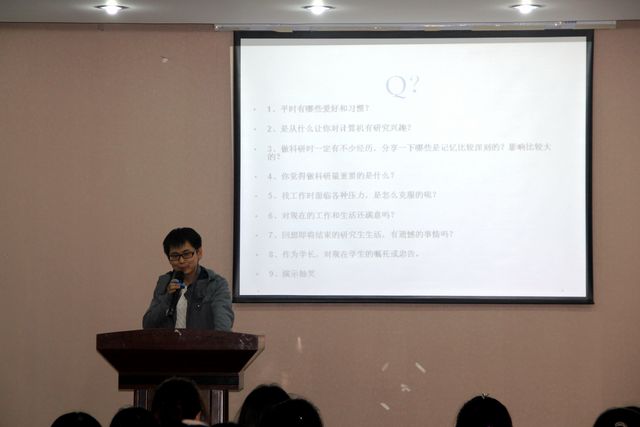 随后,高磊同学以幽默诙谐的方式讲述了他从对游戏的修改到对计算机充满浓厚的兴趣的经历。告诉大家要善于在意生活中的细节,尤其在自己感兴趣的方面,引出了心态对科研的重要性。他认为要以乐观、向上的心态对待每一件事,要善待每一个人,这样才会事半功倍。他与同学们分享了他的人生格言“要始终相信自己是幸运的”。高磊同学分享了他的应聘过程,对学而思网校、哈电、美的、娃哈哈等每一家企业进行了生动的描述与分析,并针对不同的企业介绍了不同的应聘技巧,他说:“在应聘时,要不怕失败,无论是网投还是面试,抓住每一个机会,这样才会离成功更近一步。”同时高磊同学告诉大家要多学习计算机和英语等提高自己的知识面,扩大自己的视野,只有做充分的准备,机会才会降临。