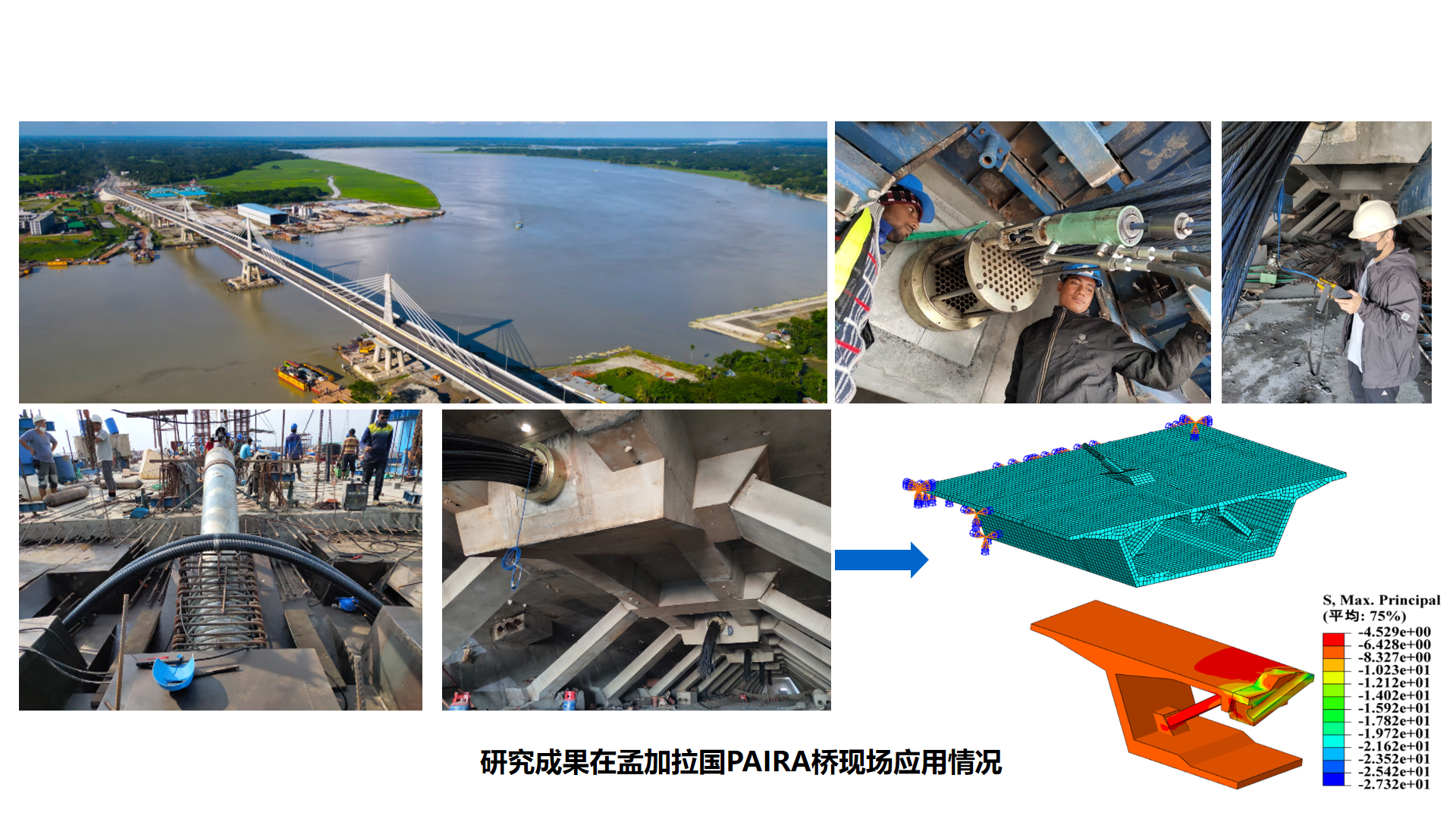相关研究成果在孟加拉国PAIRA桥主桥三塔斜拉桥施工监控项目、孟加拉国PAIRA桥主桥三塔斜拉桥健康监测系统的开发及应用及杭温铁路义乌至温州段站前四标线楠溪江大桥2×120m斜拉桥施工技术研发及服务项目中均得到了实际应用,应用效果良好,为施工单位直接和间接节约工期60天,节约施工成本约500万元。